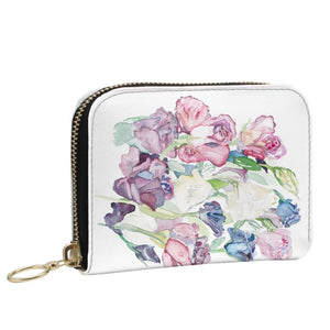 A beautiful leather purse in pinks, mauve and cream, that holds coins and cards. Rose painting by Amanda McGregor. The purse holds your money in Grace.